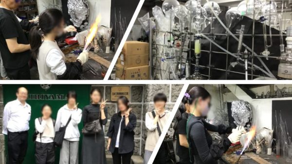 工場を見学して、ガラス加工体験をしました。 炎が見やすくなる偏光メガネをかけて、本格的なガラス加工にチャレンジしました。