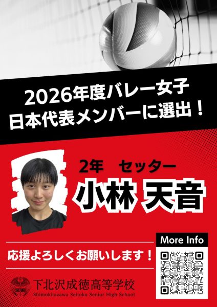 公益財団法人日本バレーボール協会により、本校卒業生の石川真佑さんが主将を務める2026年度女子日本代表チームに、本校バレーボール部2年生の小林天音さんがセッターとして選出されました。 おめでとうございます! 全校一同、心より応援しております!