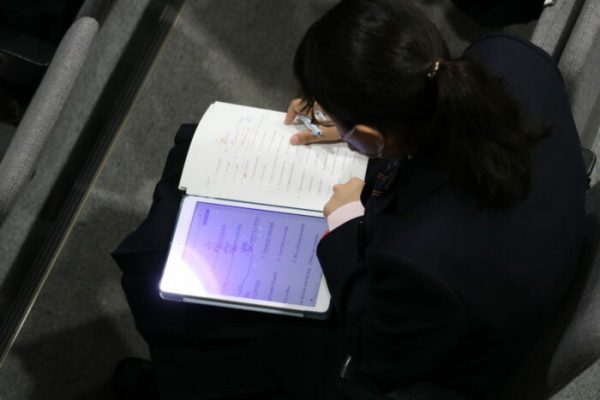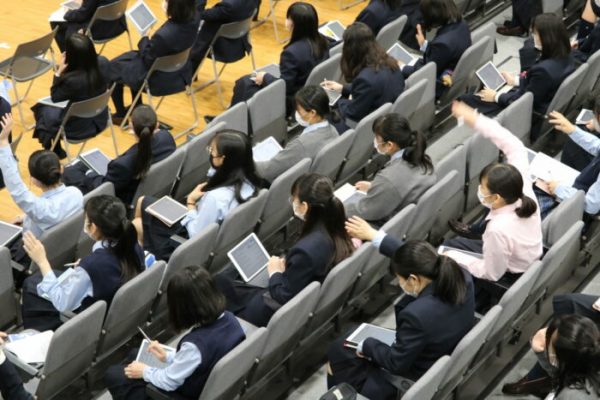 4月14日、1年生が成徳ミモザホールに集まり、削減された部分についての補習講座を行いました。真新しいiPadを使って授業を行いました。