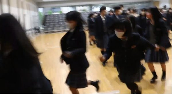 そのあとは、ミモザホールに暴漢が侵入してきた想定で、避難する訓練をしました。