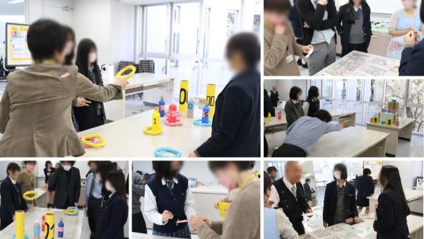 生徒が先生役。幼児に話しかけるようにやさしく遊びを教えます。 先生方は幼児役です。子ども気分で楽しく遊びました。