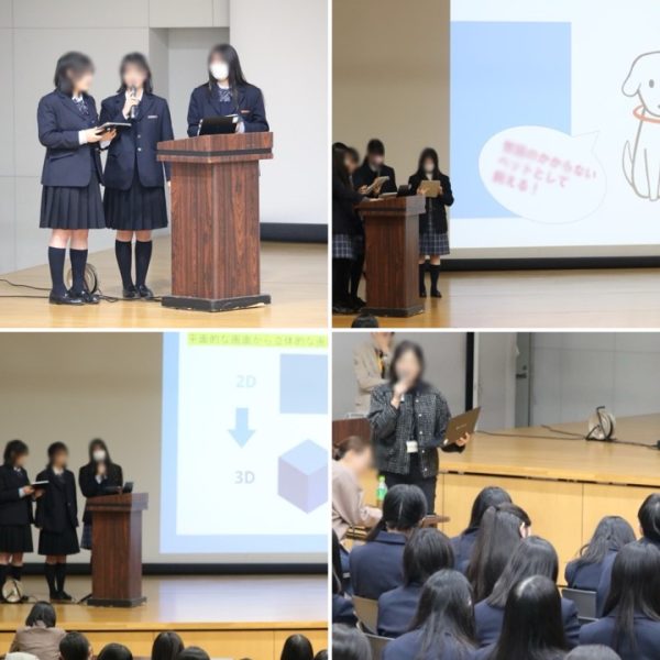 1学年生徒たちが企業探究の授業で学び、探究してきた成果の発表の場です。完成までの間に生じた困難を乗り越え、つくりあげました。