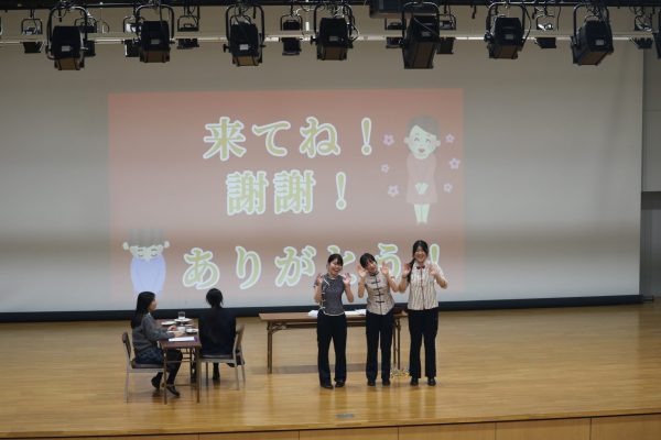 中国語クラスは、中華料理店を模したセットにて寸劇を披露し、コミカルなやり取りで観客の笑いを誘いました。