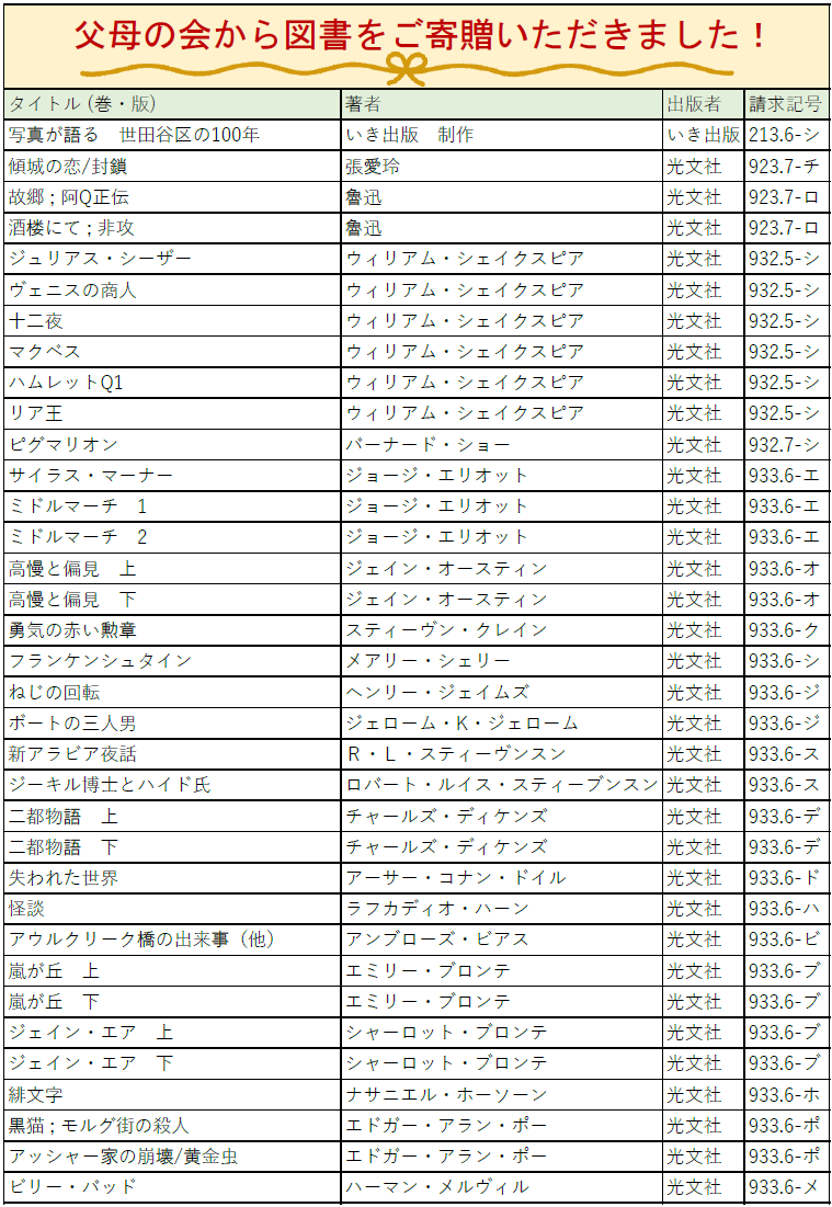 父母の会から図書をご寄贈いただきました!ご利用ください。